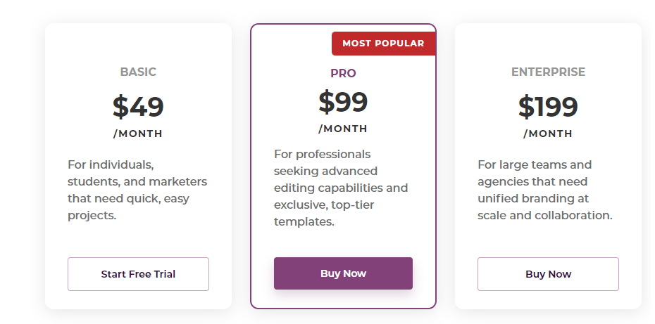 Voici les tarifs de Designs.ai pour l’abonnement à la suite complète, en fonction de la période d’abonnement (mensuelle ou annuelle) :